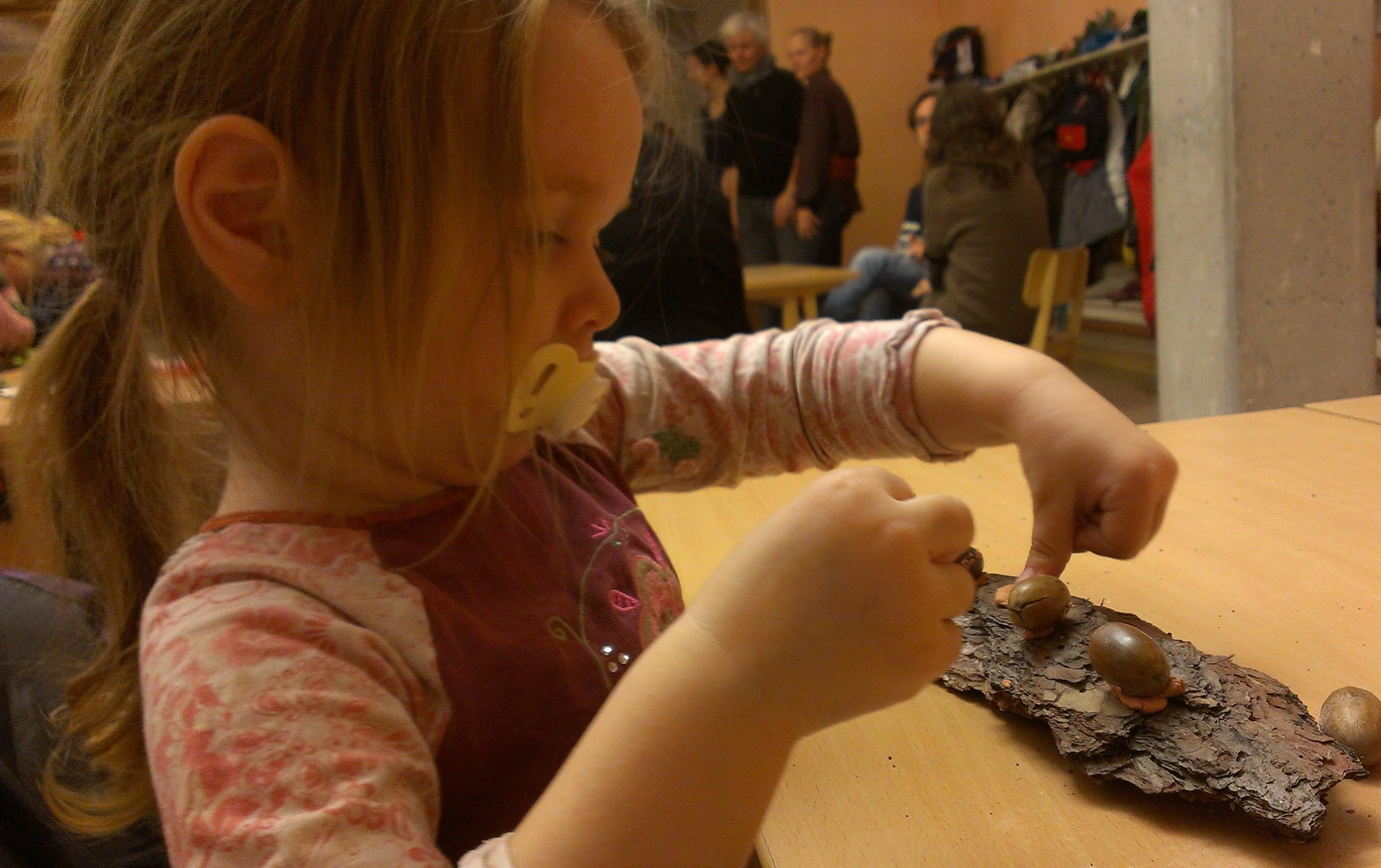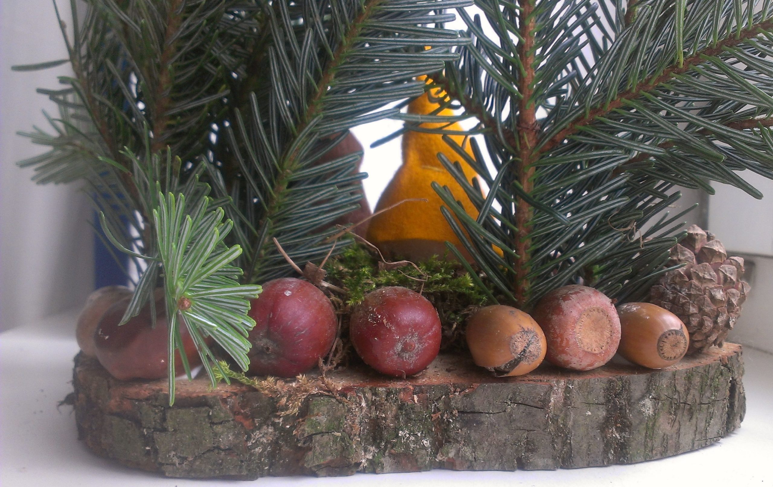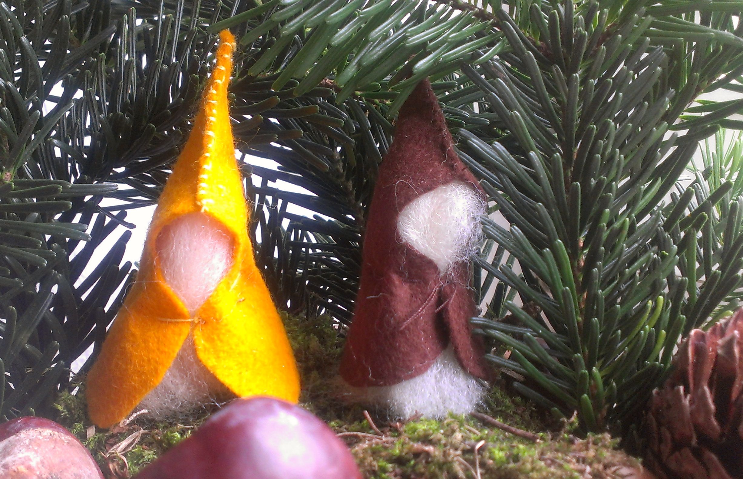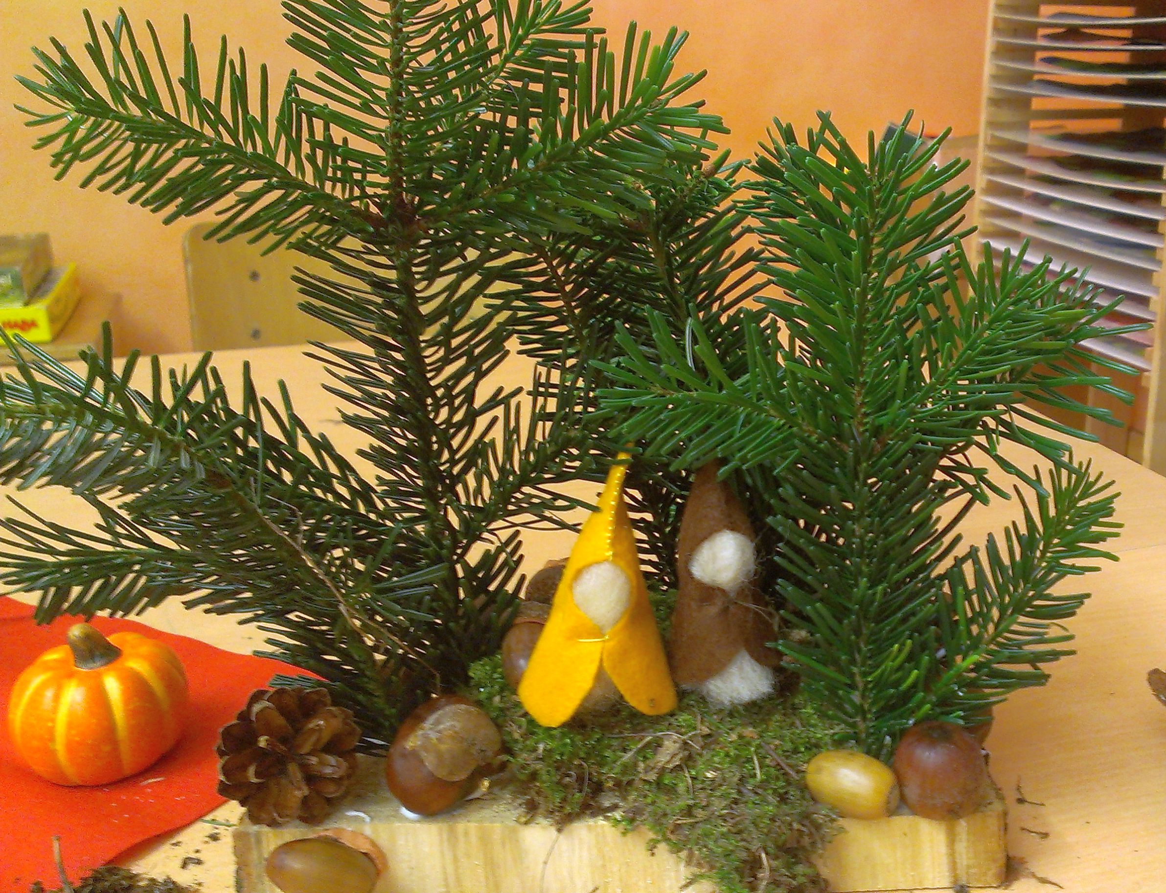 Wir waren vor ein paar Tagen auf einem Basar. Dort konnte man so kleine Wichtelhäuschen bauen, bestehend aus Wichteln (natürlich), die Basis des ganzen Häuschens ist eine halbierte Baumscheibe. Zur Deko nimmst du Eicheln, Tannenzapfen, Kastanien und Moos.
